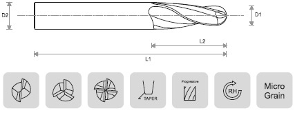 | PRODUCT CODE | TIP DIA | FLUTE LENGTH | OVERALL LENGTH | SHANK DIA | TAPER ANGLE | NO. OF TEETH |